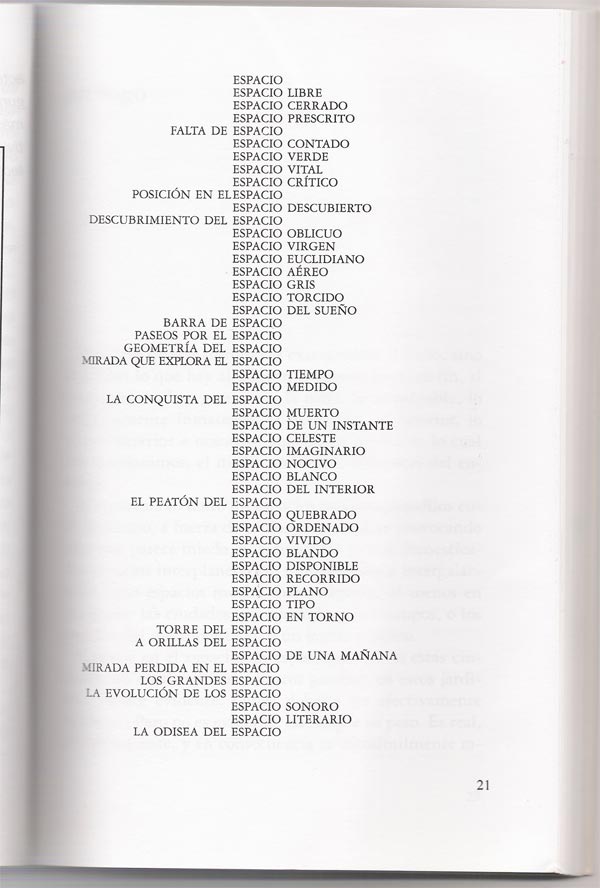 Cada sonido abre su propio espacio. Este espacio se hace manifiesto cuando encuentra resistencias (vibración en los cristales, membrana del tímpano...) y cada uno de los sonidos a nuestro alrededor crea un espacio diferente. Así, podríamos representar lo que habitualmente llamamos ruido como un conjunto de sonidos a los que no damos espacio, ponemos resistencias e introducimos dentro de un espacio pequeño fuera del cual no los dejamos manifestarse. De este modo, se solidifican en cuanto encuentran las barreras de resistencia y se manifiestan como algo molesto y dañino. En cuanto creamos espacio interno y cedemos sitio a cada uno de ellos, la manifestación de los mismos se vuelve placentera y multiforme. Este espacio interno resulta ser tan amplio como el externo y no posee límites, así la manifestación de los fenómenos puede producirse con dinamismo y sin interrupciones. Esto queda explicado en la hipótesis de causación formativa de Sheldrake, que propone que la memoria es inherente en la naturaleza y que la mente está expandida más allá del individuo (resonancia mórfica). Su coherencia con el pensamiento oriental taoísta se refleja en los siguientes versos: Antes que el Cielo y la Tierra existieran, ya había algo nebuloso, silencioso, aislado, solitario e inmutable que gira eternamente sin cesar y se puede considerar la Madre de todas las cosas. No conozco su nombre y lo llamo Tao. Si me obligan a darle un nombre lo llamaría "Grande". Ser grande significa extenderse en el espacio, extenderse en el espacio significa llegar lejos, llegar lejos significa volver al punto original. Tao Te King pág 40 También en el Islam encontramos referencias de este espacio amplio que va más allá de uno mismo: "La geometría del Tastir muestra un abismo tan vasto que concentra nuestra mente llevándola a un estado profundamente meditativo. La Forma implica pensamiento y percepción. El estado de esta meditación es el del Dikr —Recuerdo— de la Estructura Original que no llega jamás a ser alcanzada por el Intelecto. Forma repetida hasta el infinito, sin asomo de cese, de anécdota, de articulación diferente a ella misma, como si fuese una letanía visual que alcanzara su identidad en la repetición. Nuestra mente se pierde, la estructura no: sigue ahí cada vez que la miramos, recordándonos aquello que permanece siempre idéntico a sí mismo. La alternancia entre lo que permanece invariable y nuestra mente cambiante nos hace ver a nuestro propio intelecto mirándose al espejo desde la Conciencia. Del mismo modo la Conciencia muestra la finitud del Intelecto, su carácter polar y limitado. Recordemos a Malevitch con su 'Cuadrado Blanco sobre fondo blanco'. Cómo el espacio y el objeto tenían la misma forma y cómo, para expresar el movimiento de la conciencia, el cuadrado se alza suavemente inclinándose hacia la izquierda en un intento claro de diferenciarse de la superficie y de la línea, quedando sólo su significado. Forma que trata de eludir su materialidad para aludir al Contenido". link Cada manifestación, de hecho, no resulta más que ser una expresión de la energía original sin forma. Estas manifestaciones se conforman y crean debido a una reducción del espacio, a una conformación de la vibración original. Los mantras expresan todo su poder a partir de esa vibración. Así, podemos ver cómo los pensamientos surgen y aparecen como una condensación de energía, y cómo se disuelven por sí mismos en cuanto les damos espacio. Respecto a los miedos y a las tensiones, se dice lo mismo: no resultan ser más que una concentración de la energía que, en cuanto se le da espacio, se disuelven y se transforman. La paz que no es más que el espacio amplio y sin límites. De esta manera, llegamos a la conclusión de que el espacio es infinito, generador de todos los fenómenos, indiferenciable de la energía y autoemergente. Además, la capacidad de abrir el espacio es una maestría que han alcanzado los místicos de todos los tiempos. Así, vemos que sus experiencias de unificación con lo superior incluyen siempre las cualidades de paz y amor, que se manifiestan en un espacio interno indiferenciado del externo y siempre ilimitado Explicaciones acerca de la relación con el tiempo nos las ofrecen tanto Ken Wilber como Alan Watts (en el campo de la conciencia), místicos como Santa Teresa, San Juan de la Cruz, Milarepa o incluso científicos como Stephen Hawking, Fritjof Capra, Heisemberg, etc. En todos los casos, la concepción del tiempo es no lineal. También observamos que todos coinciden en la inexistencia de pasado y futuro en el espacio amplio liberado y que, en cambio, hablan de la "eternidad" del presente como momento único y autoconsistente. Podemos ver, pues, que el pasado y el futuro no son más que concentraciones de espacio que son referidas a nuestras proyecciones. Aquí se investigará sobre ese espacio, sobre el espacio y sobre la manera de pensar el espacio, aspectos que tradicionalmente han preocupado a los artistas. Para ello, hemos intentado establecer algunos criterios que sirvan como balizas 1 demarcadoras de orientación en esta búsqueda, pero que, en su calidad de señales móviles, no entrarán a definirlo (lo consideramos inefable), sino que ayudarán a tomar decisiones a la hora de marcar el rumbo en este viaje.