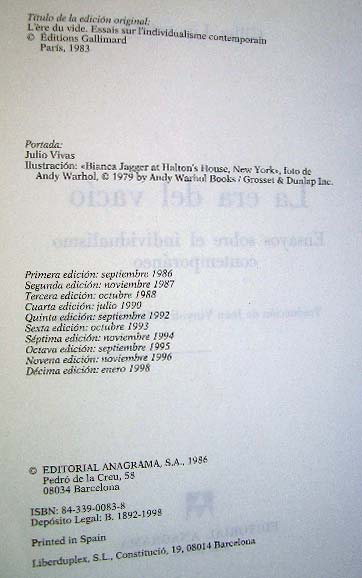 bibliografía: La era del vacío. Ensayos sobre el individualismo contemporáneo |