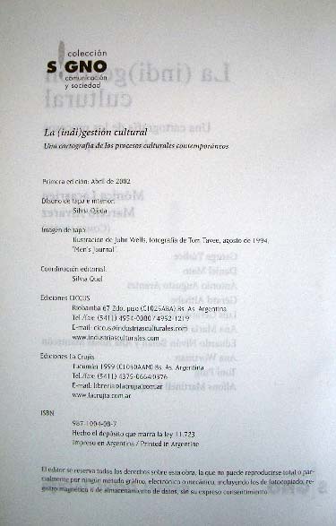 Autor: Mónica Lacarrieu y Marcelo Alvarez (Compiladores)Este libro recientemente publicado por CICCUS/La Crujía en su colección Signos explora la tensión entre los límites actuales y la gestión de la extensividad cultural, de cara a las tendencias en juego: la diversidad, la interculturalidad, la creatividad y el desarrollo sostenible, a través de una serie de textos que otorgan un rango especial a los modos contemporáneos en que se piensan y reinventan las políticas, los proyectos, las producciones y los servicios culturales de diversas organizaciones estatales, privadas e independientes (asociaciones de artistas, de vecinos, ONG´s) de la cultura en América Latina y Europa.