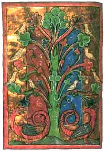 | The doves are the faithful Christians, who are safe from the devil as long as they remain in the church. Christ is the right side of the tree, the holy spirit the left side. The devil is afraid of the church and will not come near, but the Christian who leaves the church should beware. The Aberdeen Bestiary has a slightly different interpretation: " Take the tree as God, the shadow as his son... Take the fruit to be the wisdom of God, that is, the Holy Spirit." The rest of the allegory is basically the same as usual. |