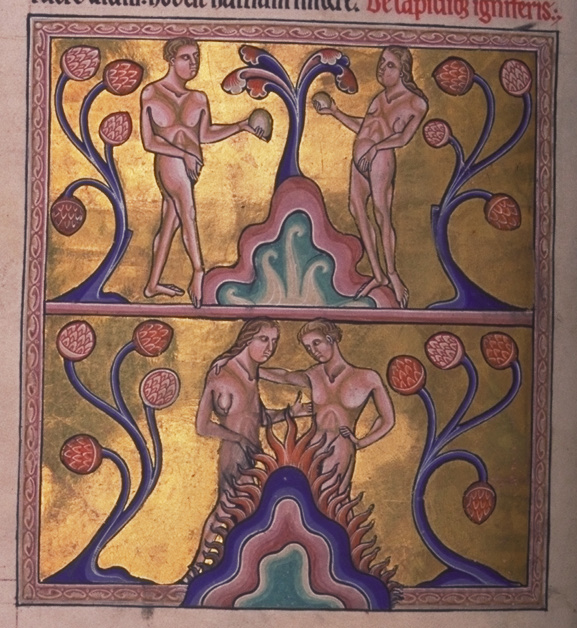 Most illustrations show a man and a woman surrounded by flames, sometimes holding the stones; the burning stones alone are sometimes shown.