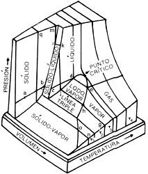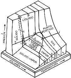 En la imagen superior se muestra el diagrama PVT (presión-volumen-temperatura) de una sustancia que se expande al fundirse, y en la inferior el de otra que se contrae; este último es el caso del agua y la razón por la que los hielos flotan. Se ve que la sustancia puede existir en las fases líquida, sólida o gaseosa, que dos fases pueden coexistir y, en la línea triple, son posibles tres fases a la vez.