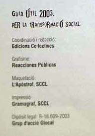 Autor: Grup d'acció Glocal GUIA ÚTIL 2003 Per a la transformació social Ens satisfà fer-vos saber que.... Ja podeu veure TOTA la guia útil 2003 per a la transformació social a la web: www.moviments.info En concret en el link: http://216.218.191.154/moviments/indexpaginas.html Són 144 planes que inclouen: 64 planes amb presentacións de projectes 22 planes de directori de col.lectius i espais socials alliberats 46 planes d'altres recursos útils En total, més d'un miler de contactes, recursos i lluites! Una informació producte de la xarxa colectiva no pot ser propietat de ningú i per això tot el seu contingut és anticopyright: - La guia es pot veure lliurement en la web moviments.info - Es pot fotocopiar, inclús sencera. - Tota la part de recursos i directoris pot ser modificada i ampliada sempre que la nova versió segueixi mantenint la mateixa llicencia anticopyright. ( veure-la a la part inferior de la pg nº 1 "com utilitzar aquesta guia" ) Tot i així, evidentment, recomenem, disposar del llibre imprés, per dur a sobre, com a necessària eina de consulta que no pot faltar en un espai físic. Per això, estem treballant per a que la guia útil arribi a tot arreu, voleu col.laborar? Fins ara, la podeu trobar en els llocs que apareixen en l'apartat "On trobar la guia útil: punts de venda" : http://216.218.191.154/moviments/venda.html Recordem que La Guia Útil 2003 per la transformació Social té un preu de venta al públic de 5 euros. Per tal de potenciar-ne la distribució, realitzem les següents propostes de venta, segons quantitats: · Venedors i Venedores: 3 euros, · Distribuïdores a venedors/es: 2 euros. Proposta especial per a distribuidors/es Estem especialment interessats/des en trobar col.lectius que vulguin assumir la distribució a la resta de col.lectius de la seva població o comarca, per això us oferim deixar-vos en dipòsit (sense haver de pagar res per avançat) una caixa de 36 guies útils, que us deixaríem a 2 euros per cada guia distribuida. Quan fa poc menys d'un mes que va sortir, s'han distribuit 2300 exemplars dels 10.000 editats. Es segur però que a molts col.lectius i poblacions encara no hi ha arribat. Necessitem col.laboració per que la Guia sigui coneguda i arribi a cada indret de Catalunya: Participeu en Fer Còrrer la llavor de la transformació social. Presenteu-la, recomeneu-la, distribuiu-la, D'altra banda us fem saber que en unes setmanes presentarem també a moviments.info un directori que inclourà més de 2600 col.lectius, amb un sistema de búsqueda que facilitarà encara molt més l'accés a la informació. En aquest sentit qualsevol dada errònea, col.lectiu que falti o actualització ens agradaria que ens la fessiu arribar a guia@moviments.info tant PER A UN CONEIXEMENT D'US LLIURE... ALLIBEREM LA INFORMACIÓ!!! Més info a www.moviments.info guia@moviments.info Tf 902 02 02 89 (preu trucada interprovincial) I nou telèfon recomenat per trucades des de Barcelona: 932170623 Im�genes: