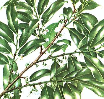 A medium sized evergreen tree with dark reddish brown smooth bark. Leaves are alternate, thick coriaceous, entire on the margin, deep gree and lustrous above, pale yellowish green beneath.
