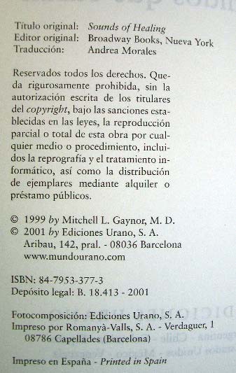 Autor:Mitchell L. GaynorSonidos que curan - Dr. Mitchell L. Gaynor El doctor Gaynor tiene una visión holista de la medicina que sorprenderá a muchos lectores: a la vez que utiliza todos los medios que la farmacología, la cirugía y la técnica ofrecen para curar a sus pacientes, también recurre al poder curativo del sonido, la voz o la música. El sonido de los cuencos de cuarzo o tibetanos, la propia voz cantando mantras o la brillantez de la música clásica son algunas de las herramientas que usa, y que nos enseña a usar, por medio de una descripción vivencial de su trabajo y de ejercicios prácticos. "Pocas cosas pueden compararse al poder de la música para evocar nuestras emociones más profundas. Imagínese que puede tener a su alcance este poder mientras realiza un tratamiento de quimioterapia." Pues esto es exactamente lo que está haciendo el Dr. Gaynor. Este libro recoge los maravillosos resultados que ha obtenido. "Es una obra que revolucionará la medicina". ha dicho la Dra. Christiane Northrup
